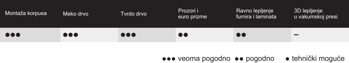 Za sve namene lepljenja koje zahtevaju povećanu otpornost u vlažnim sredinama, npr. za vrata, prozore i nameštaj u vlažnim sredinama. Lepak opšte namene za lepljenje tvrdog i mekog drveta, kao i za iverice i druge podloge na bazi drveta, za lepljenje velike čvrstoće, za polaganje parketa i laminatnih (jezik i utor) podova i za furniranje.