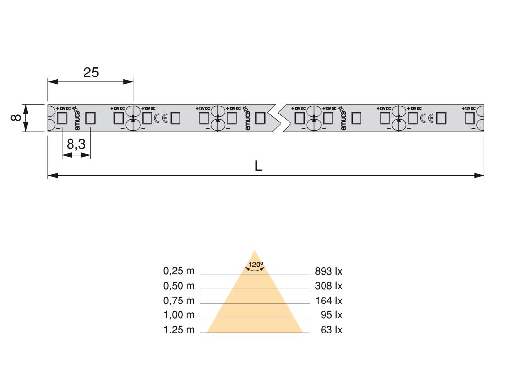 Planiranje: Informacije za poručivanjeLLumenJačinaEfikasnostBoja svetlostiBroj diodaŠifra5m660 lm/m9,6 W/m69 lm/W6000K120 Dioda/m52007205m660 lm/m9,6 W/m69 lm/W3000K120 Dioda/m5200820