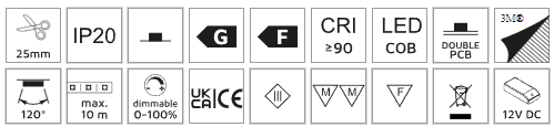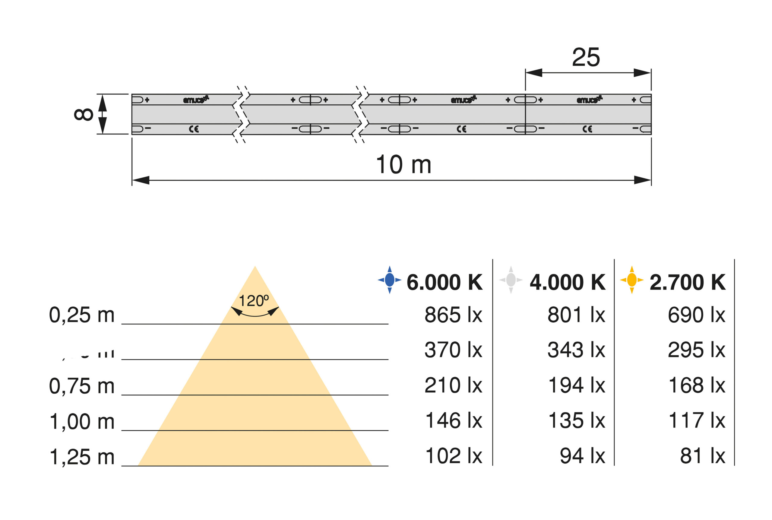 Planiranje: Informacije za poručivanjeLLumenJačinaEfikasnostBoja svetlostiBroj diodaCRIŠifra10m501 lm/m4,8 W/mG (104 lm / W)6000K320 Dioda/m>90522072010m464 lm/m4,8 W/mF (96 lm / W)4000K320 Dioda/m>90522582010m400 lm/m4,8 W/mG (83 lm / W)2700K320 Dioda/m>905226020