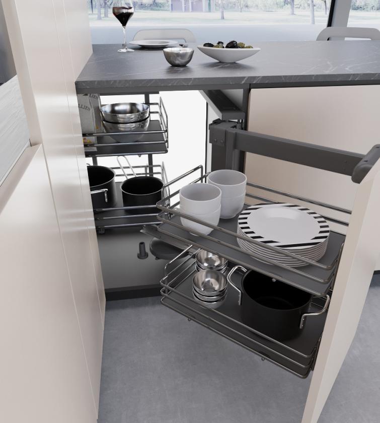 Ugaoni mehanizam, za kuhinju. Pregrade za odlaganje su napravljene od ovalne žice i HPL dna. Protivklizni tretman na zahtev. Dostupno u dve različite visine, dodatne informacije dostupne su u tehničkom listu sa podacima.