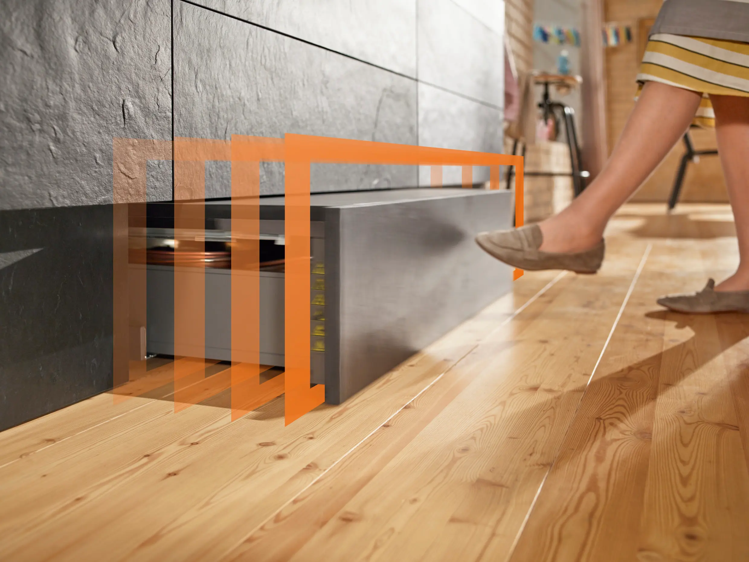 SPACE STEP se savršeno integriše u sve Blum sisteme kliznih i standardnih fioka. Vizuelno, on ne narušava dizajn kuhinje – naprotiv, doprinosi eleganciji celokupnog ambijenta.